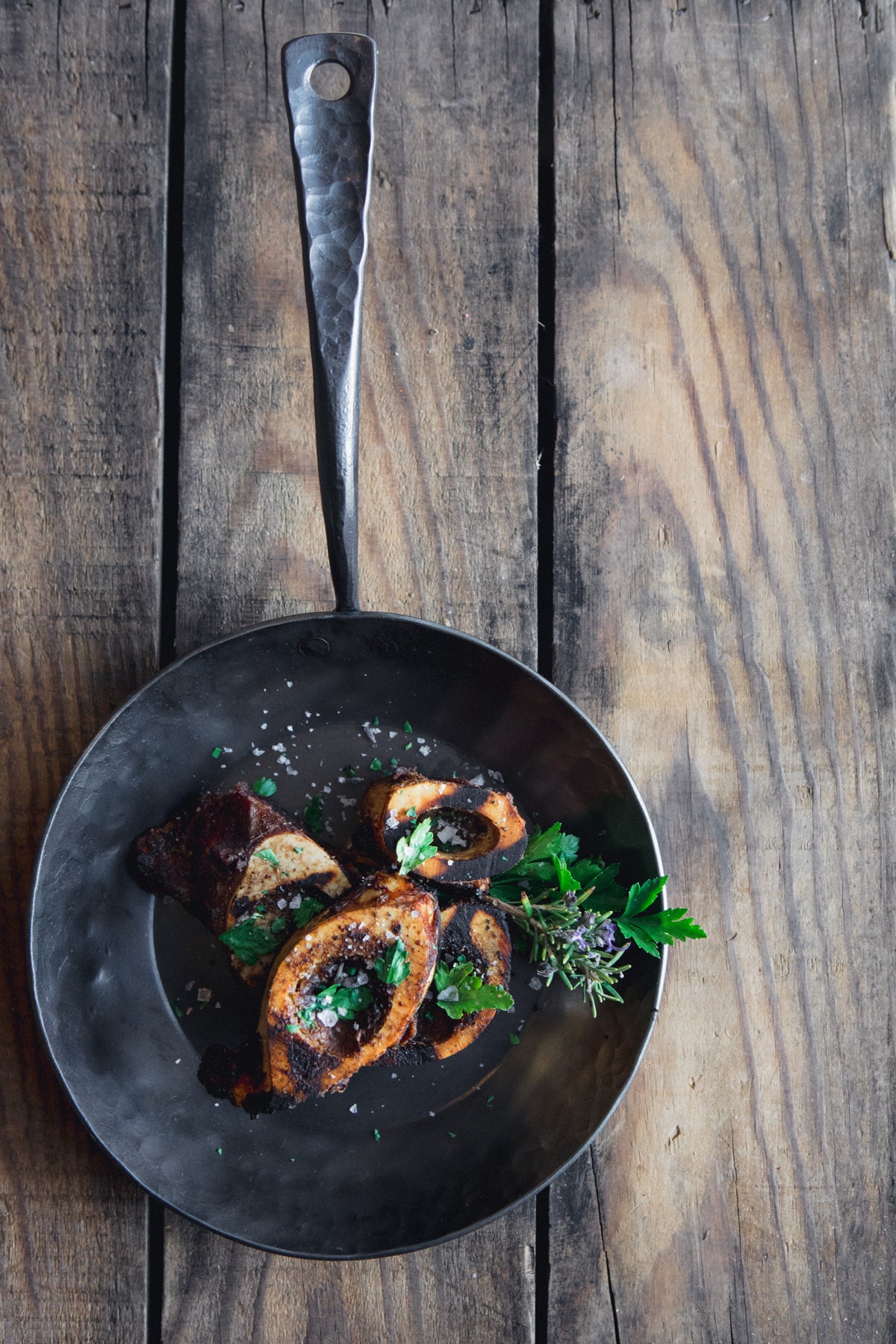 Grilled over red oak, with salt & pepper, at medium heat (move your hand overheat for 3 sec). Cook until caramelized approx. 2 min per side. Until the bone is caramelized, and the marrow is bubbly. Season with Kosher salt and fresh ground black pepper.