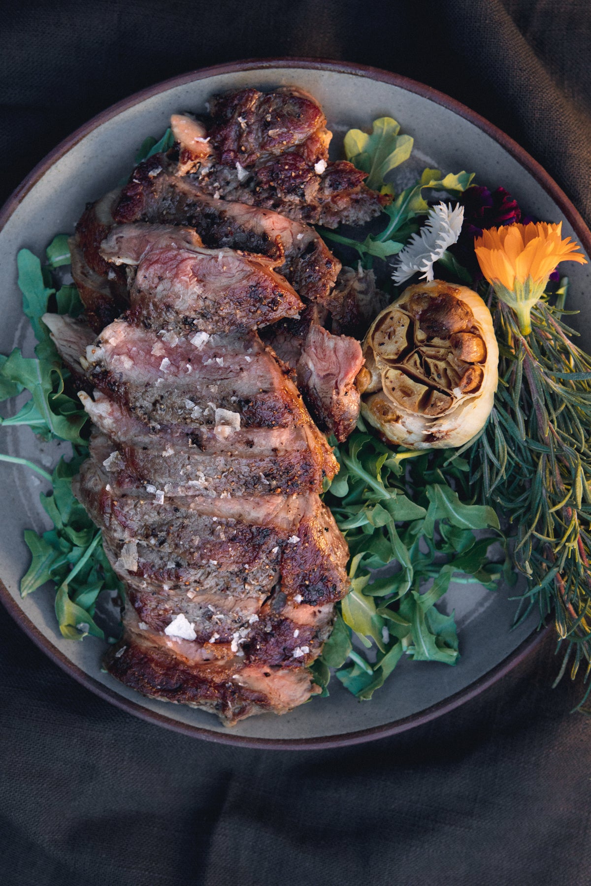 Carefully pat the steak dry with paper towels. Season liberally on all sides (including the edges) with salt and pepper. Heat the oil in a 12-inch cast-iron skillet over high heat until just beginning to smoke. Carefully add the steak, reduce the heat to medium-high, and sear for 2-3min until a thick crust has formed then flip and sear other side for 2-3min. Add the butter, herbs, garlic, and lemon rind if using, to the skillet and continue to cook, flipping the steak occasionally and basting it with the foaming butter, garlic, and thyme until a thermometer inserted into thickest part of the steak, away from the bone, registers 120°F for medium-rare, or 130°F for medium, 4 to 8 minutes longer. To baste, tilt the pan slightly so that butter collects by the handle and use a spoon to pick up the butter, and pour it over the steak, aiming at the light spots. If the butter begins to smoke excessively or the steak begins to burn, reduce the heat to medium. When the steak is done, transfer it to a rack set in a rimmed baking sheet. Let rest for 5 to 10 minutes. Carve, garnish with edible flowers & herbs and serve.