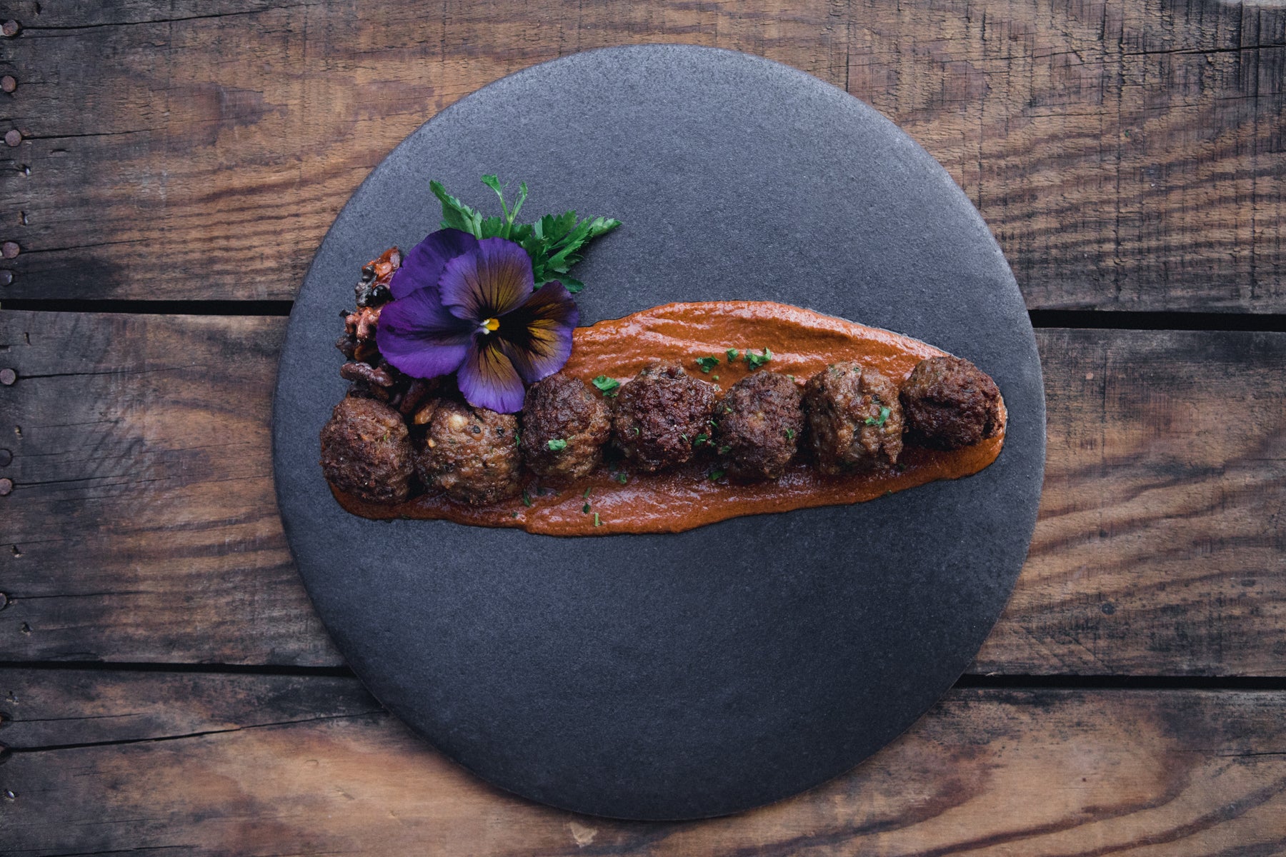 Roast off walnuts at 350 degrees for 20 minutes. Add EVOO, S&P toss ½ way through until you smell strong roasted nut aroma. All into blender, blend until smooth, nut butter consistency.Puddle on plate, placing meatballs atop Romanesco. Serve remaining Romanesco inside dish for dipping