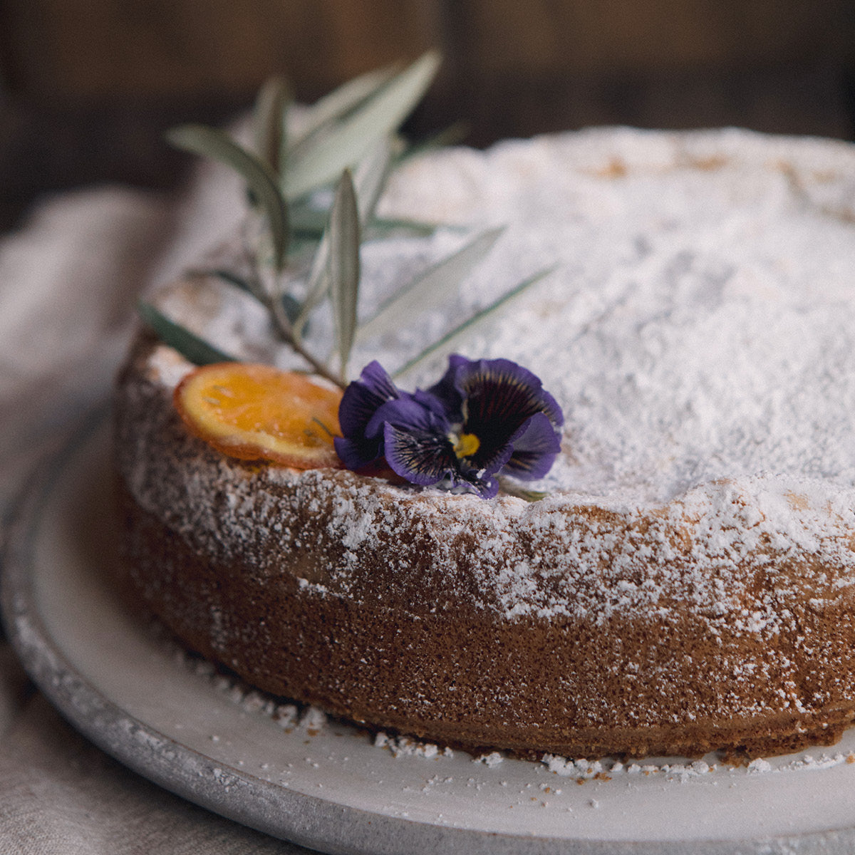 Bake for about 45 minutes, until puffed and golden, and a toothpick inserted in the center comes out clean. Cool cake in pan on a rack for 10 minutes. Run a knife around the edges then release the side of the pan. Cool cake to room temperature. Remove bottom of pan and parchment paper. Transfer cake to serving platter. Garnish with fresh edible flowers(SLO Creek Farms).