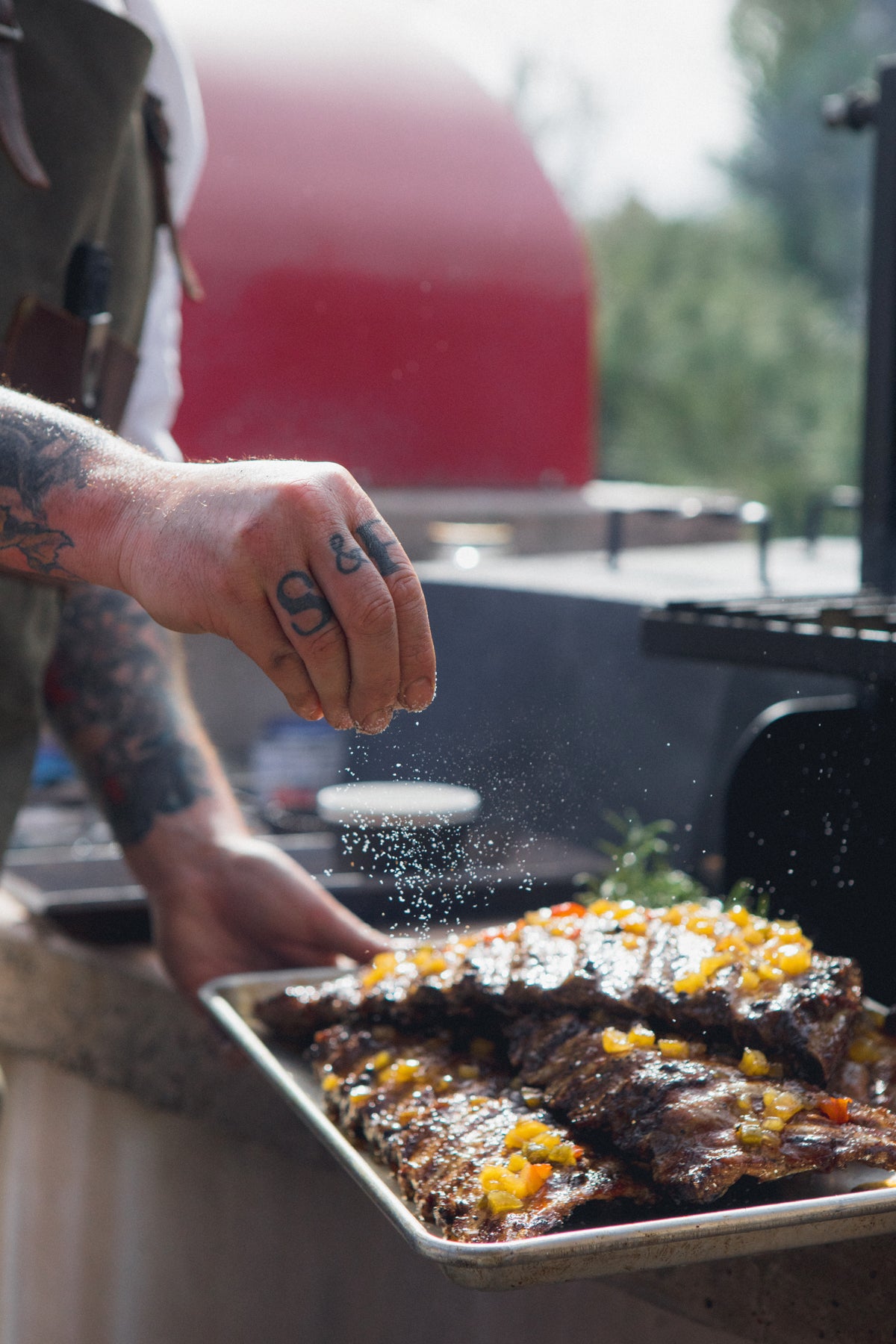 Pat ribs dry with towel to rid all moisture. Coat with EVOO on both sides. Season well with Kosher salt and fresh cracked pepper. Grill on medium heat for 15min on each side basting with apple juice using fresh rosemary mop. Coat ribs in peach jalapeno jam and grill for an additional 5 min then dust with salt and pepper. Cook until internal temp reads 140d e.g., carry over cooking will raise internal temp 5 deg during rest. Let rest on a baking sheet for 10min then carve and serve.